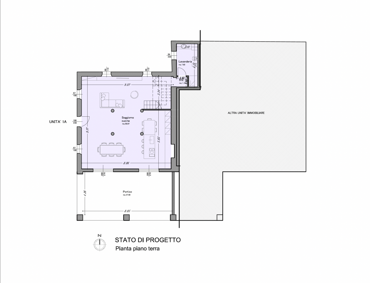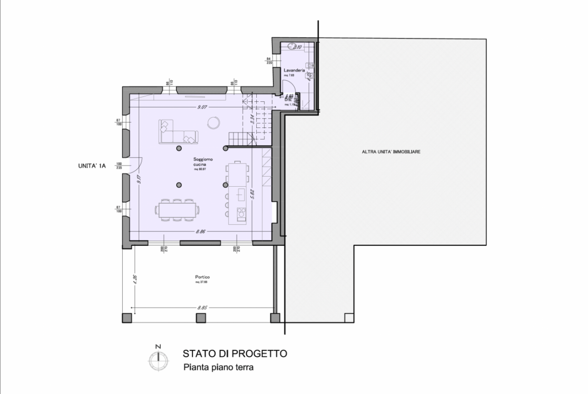 al piano terra zona giorno di 80 mq da personalizzare in base alle proprie esigenze, portico di 38 mq e bagno;