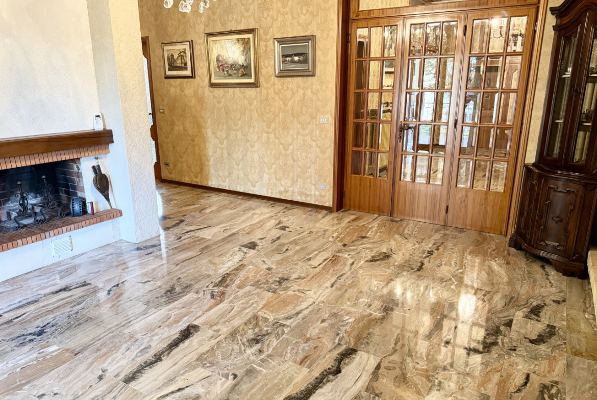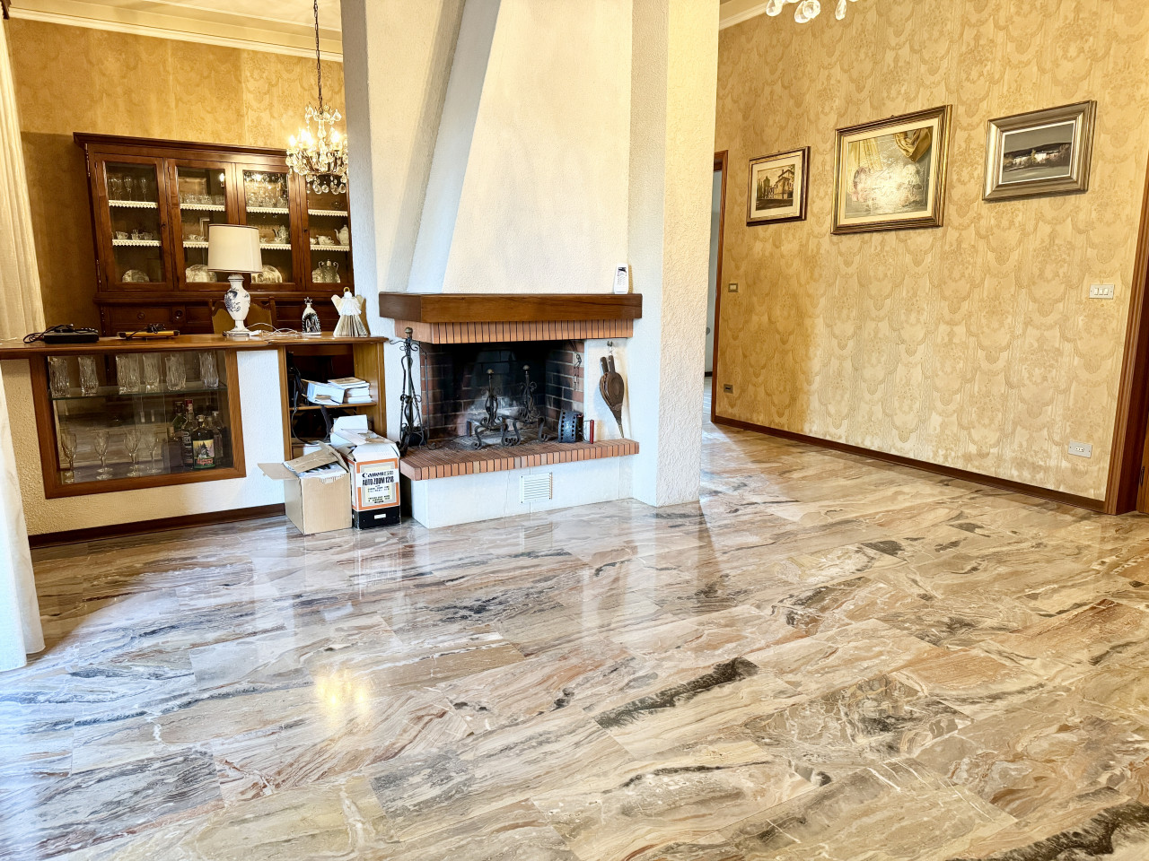 ingresso, soggiorno con camino, sala da pranzo, cucina abitabile, studio, tre camere da letto, due bagni, balcone e due terrazzi al piano rialzato;